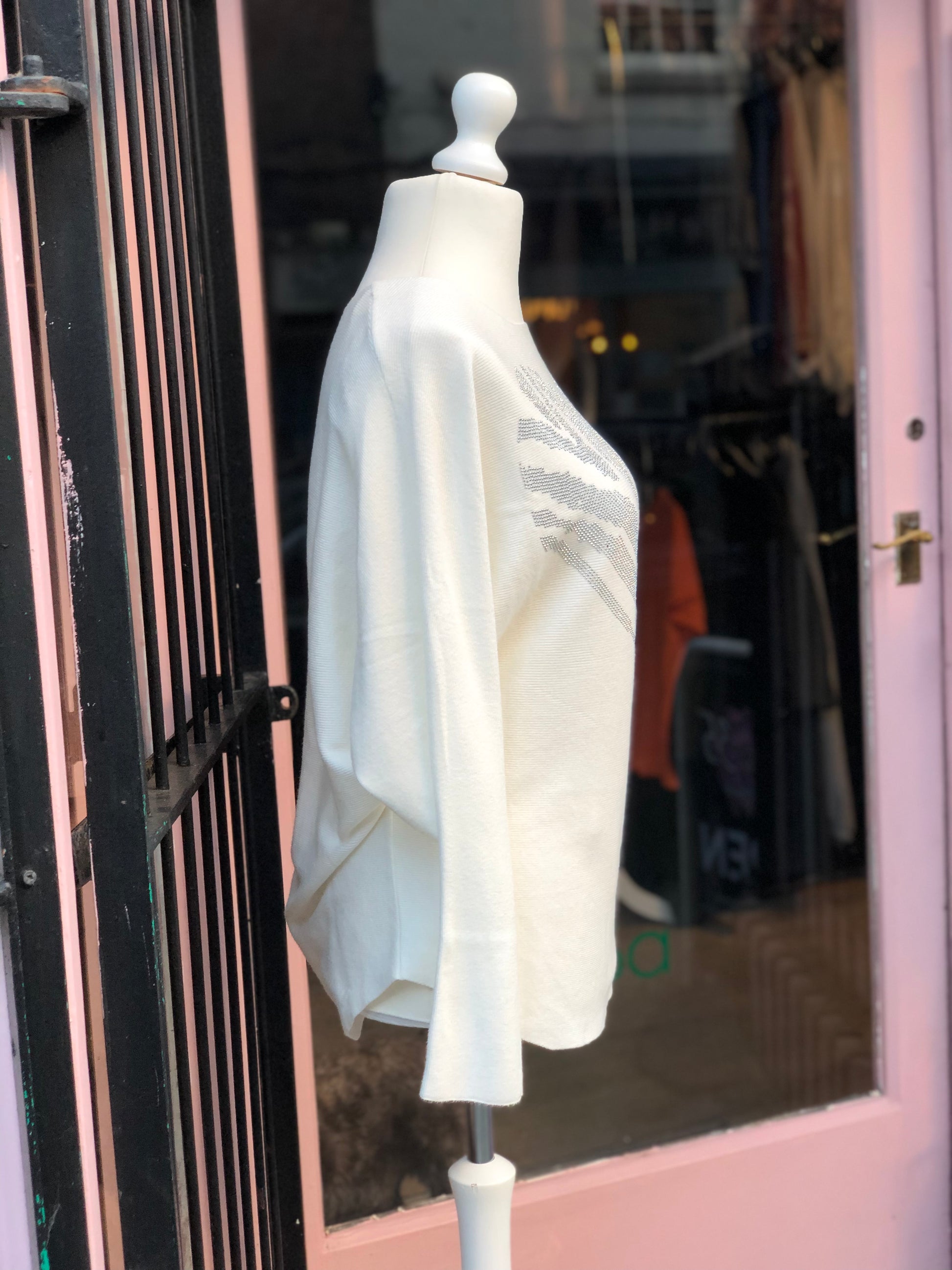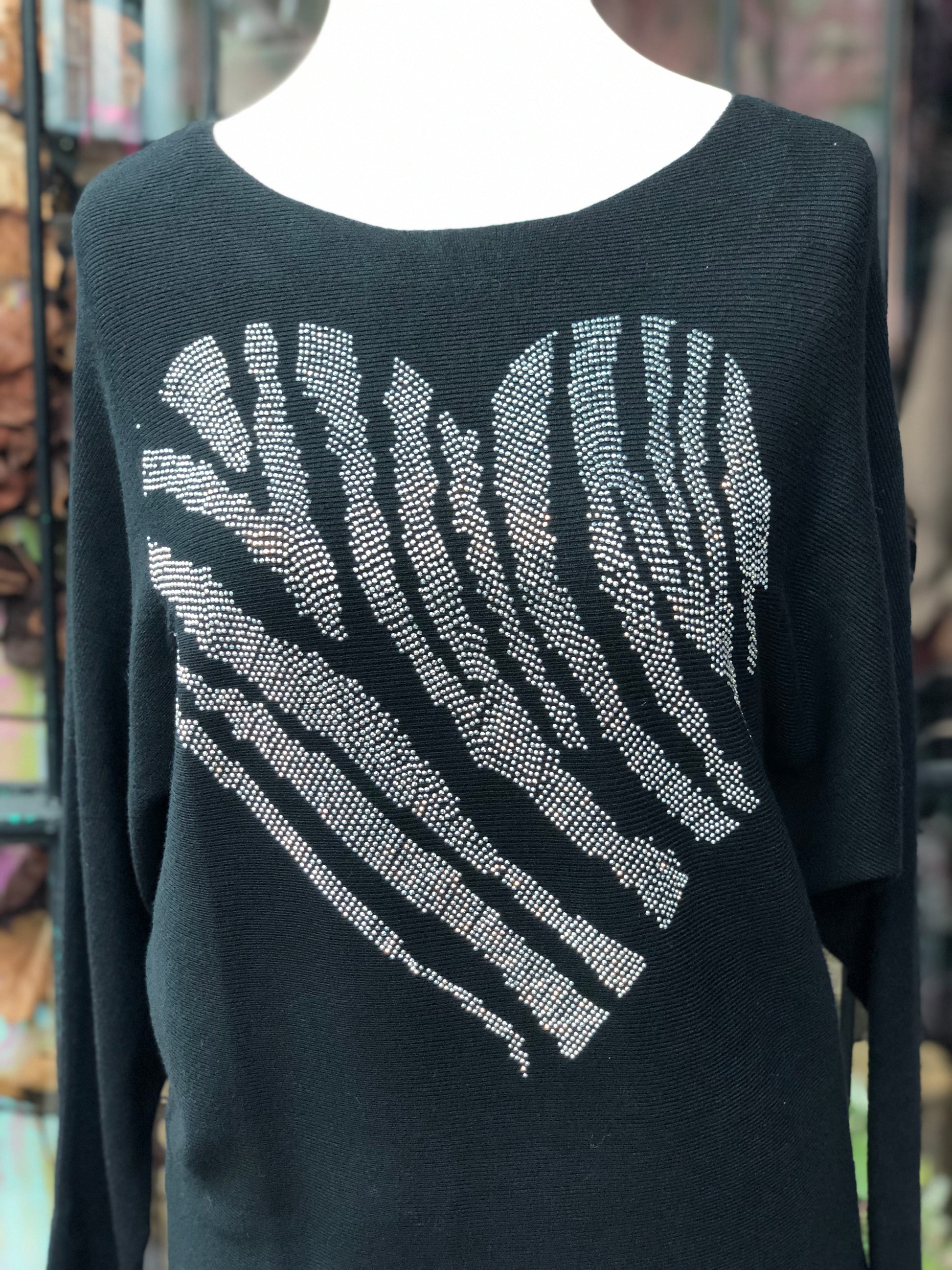 A soft, ribbed, batwing style jumper with diamanté heart detail.